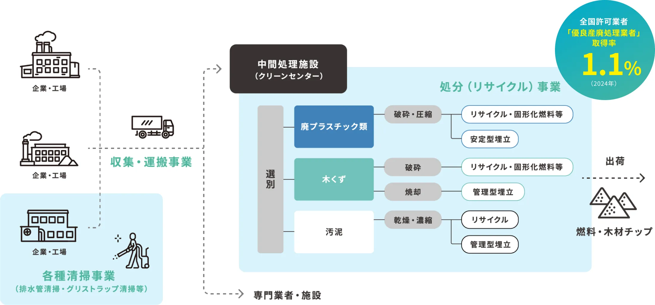 「優良産廃処理業者」を取得しており、自社のクリーンセンターを核に、多種多様な「品目」に対応できます。